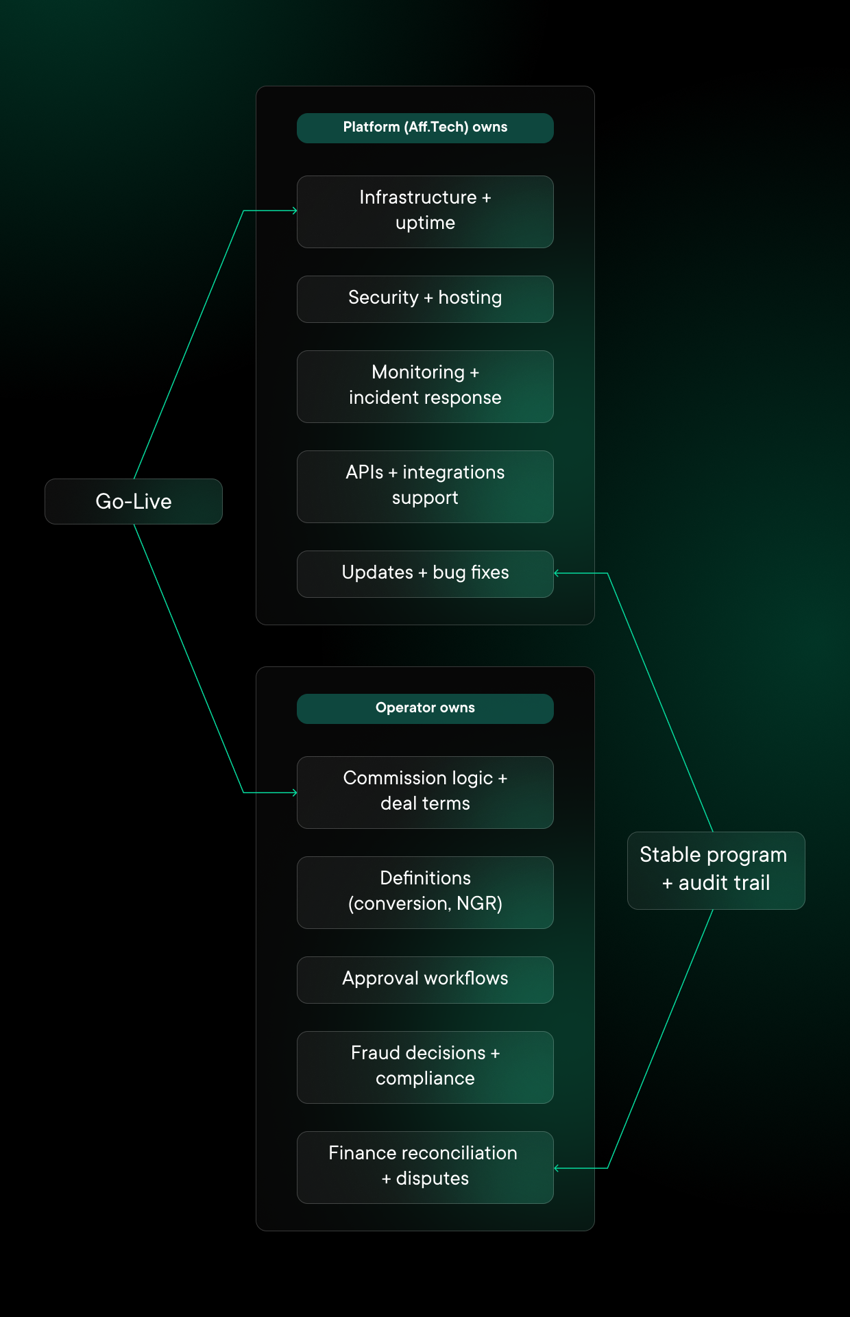 Yes. Aff.Tech provides ongoing technical support after go-live, including monitored infrastructure, uptime SLOs, security management, and regular platform updates. Our team remains available to resolve technical issues and support performance monitoring. While we handle infrastructure and system health, operators retain control over commission governance, fraud oversight, and financial reconciliation to ensure long-term program stability.